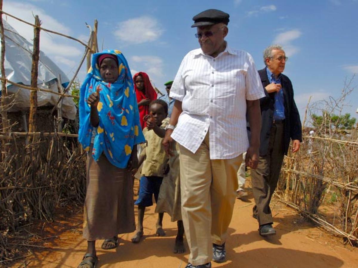 Desmond Tutu and Lakhdar Brahimi meet young Darfuris during their visit to Otash, a camp for internally displaced people in Nyala, Darfur.