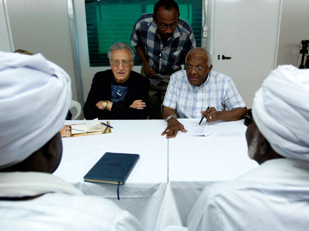 Lakhdar Brahimi and Desmond Tutu meet representatives from civil society organisations in El-Fasher, Darfur.