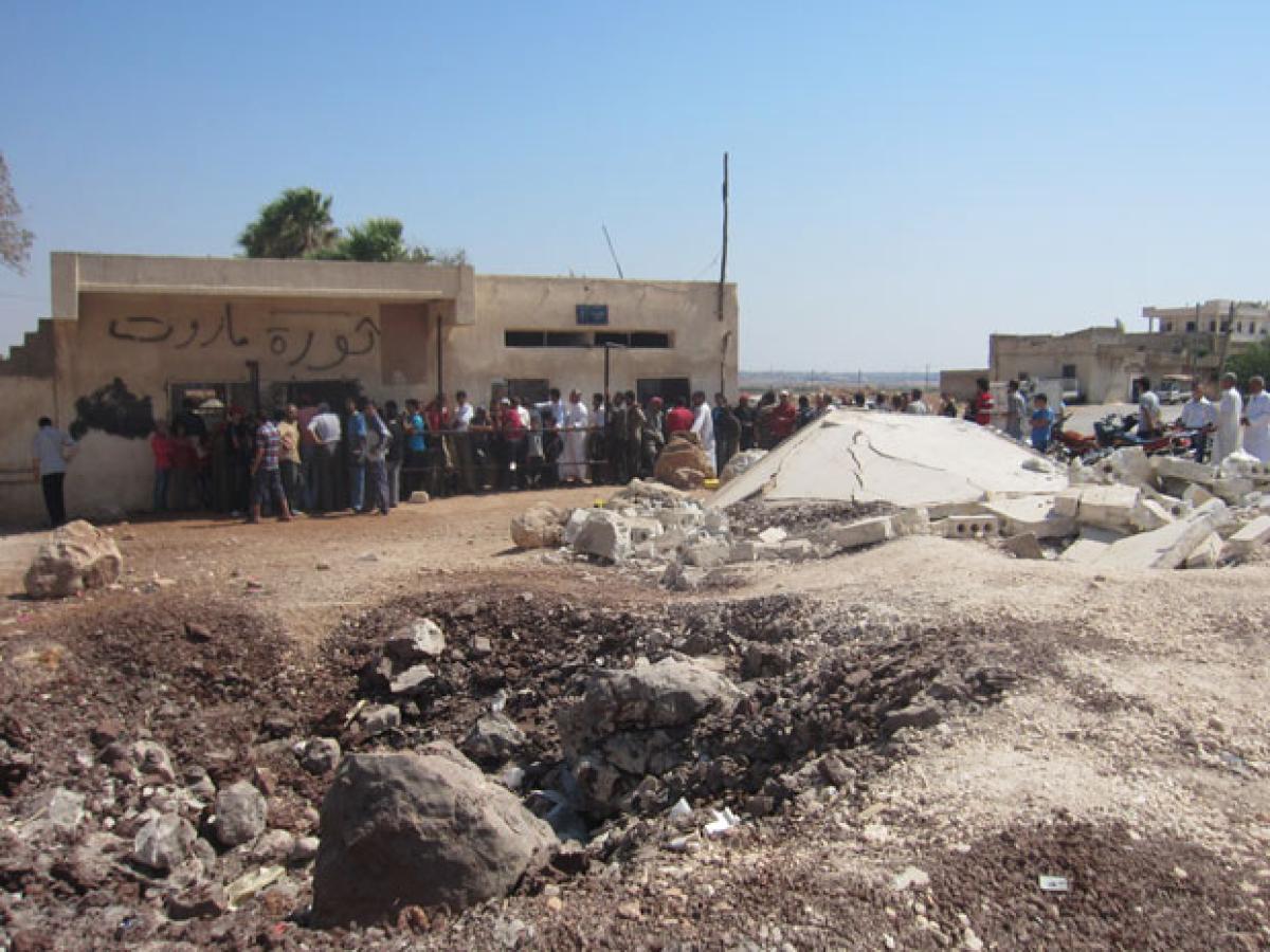 The destruction of irrigation and other infrastructure has halved the amount of food being grown in Syria, causing serious food shortages. In this photo, residents of Ma’arat Misrin queue for bread next to a large crater from a recent air strike.